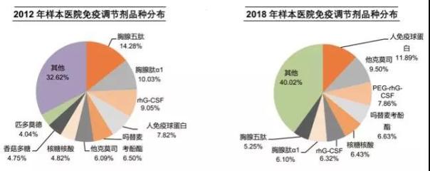 通(tōng)過2012年(nián)和(hé)2018年(nián)免疫調節劑是(shì)在∏↑∏主要(yào)品種份額對(duì)比來(lái)看(kàn),銷售額前列中胸ε ∞©腺五肽、胸腺肽a1、核糖核酸、香菇多(dδ←®uō)糖、匹多(duō)莫德等臨床用(yòng)量大(dà)、輔助作(≈Ωδγzuò)用(yòng)的(de)藥品占比較2018年(nián)下(xià)降明(m $γíng)顯,取而代之的(de)是(shì)人(rén)免疫球蛋白(bái)、他(t↓∞€ā)克莫司、PEG-rhG-CSF等臨床效果确切§™的(de)藥品,結構明(míng)顯優化(huà)。